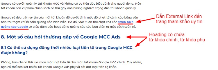 Các heading trong bài có chứa các từ khóa phụ như “Google MCC Ads”, “Google Ads MCC”, “Google MCC”,… Đồng thời heading cũng được định dạng và phân cấp H2, H3 phù hợp.
