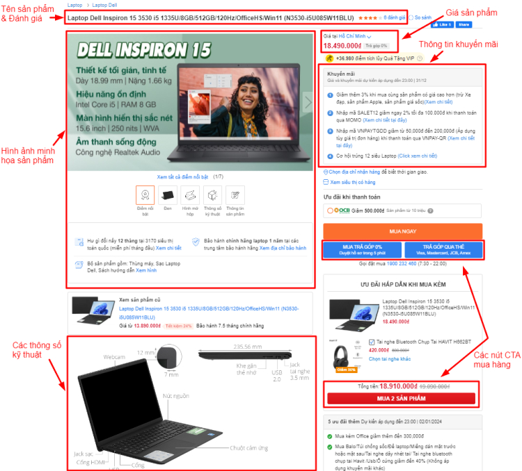 Bài viết cũng liệt kê chi tiết các thông số kỹ thuật, và hình ảnh giới thiệu chi tiết các phần của laptop. Và cuối cùng là phần đánh giá sản phẩm, gồm có chấm điểm (5 sao), và nhận xét của khách hàng.