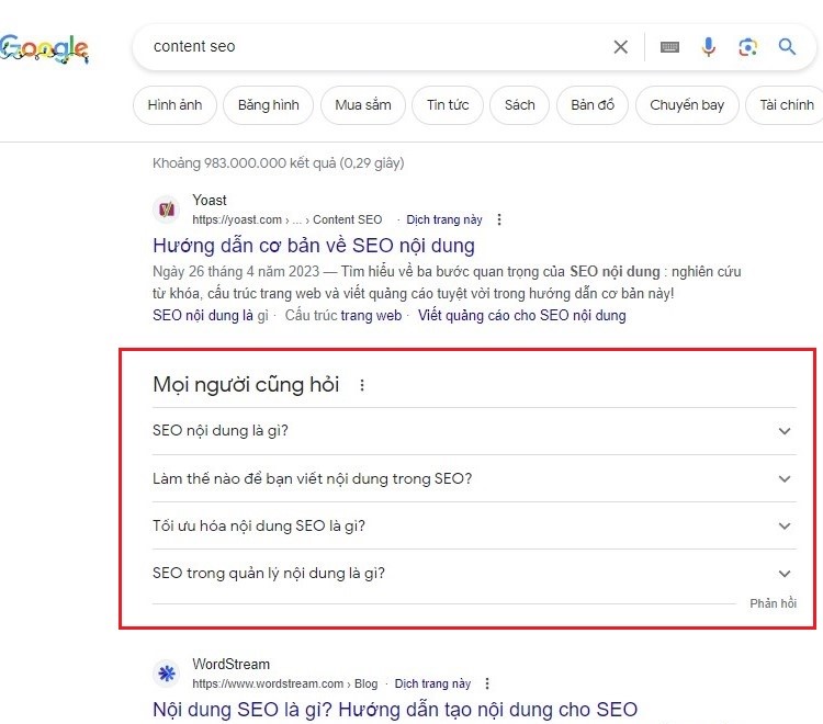 Ngoài ra, trong quá trình tìm kiếm từ khóa chính, bạn có thể phát hiện thêm nhu cầu thực tế của khách hàng xoay quanh từ khóa đó. Bạn nhập từ khóa và tìm kiếm trên Google, rồi chọn vào phần “Câu hỏi thường gặp”.